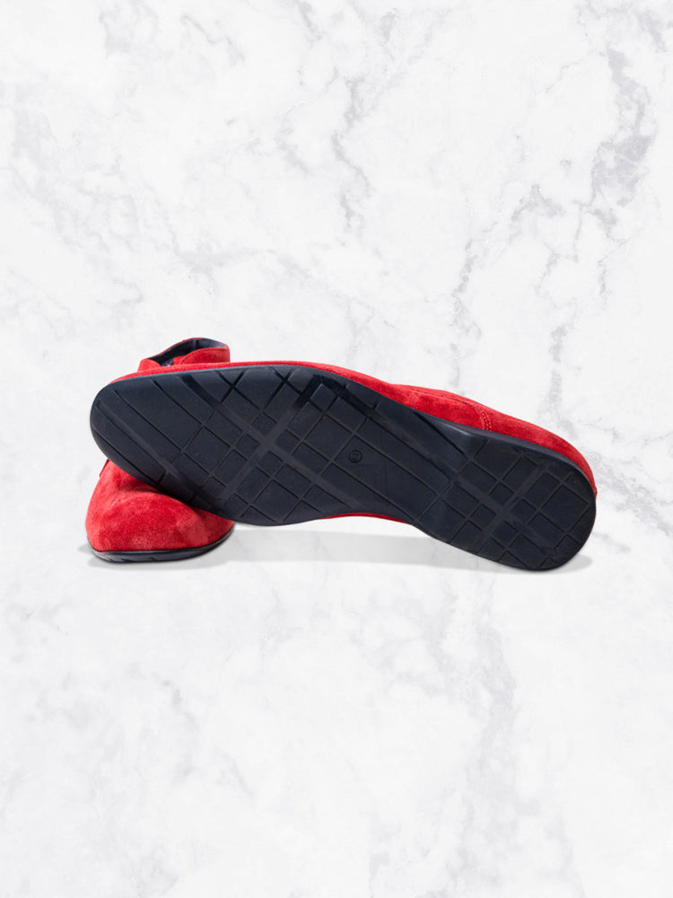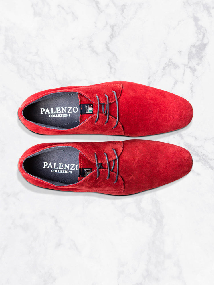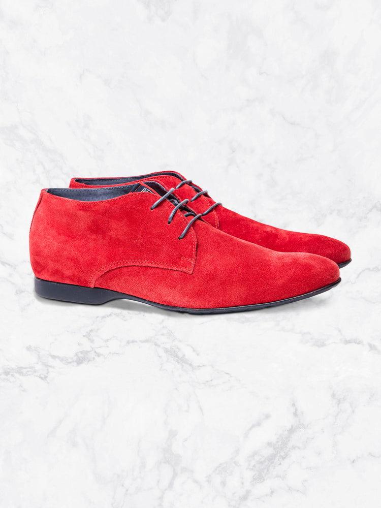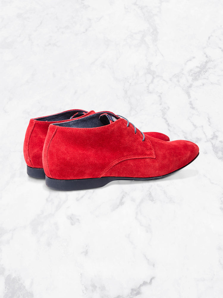 Souliers en daim rouge, semelle gomme, 100% cuir.