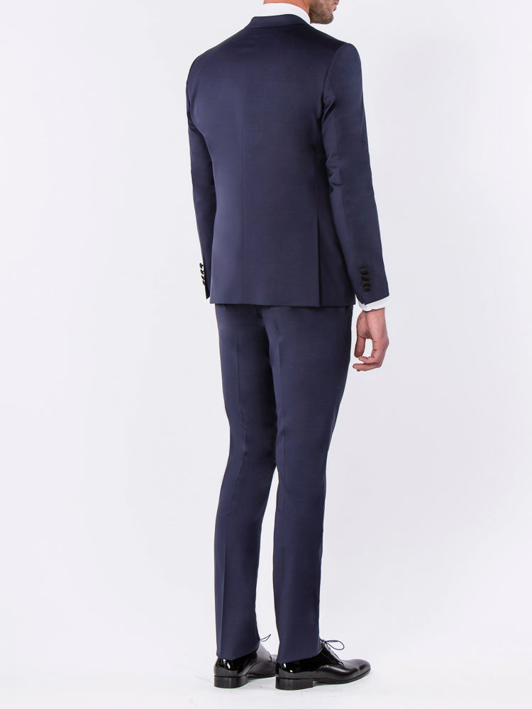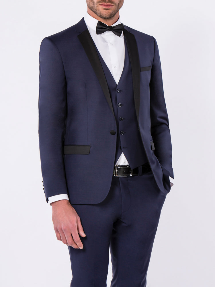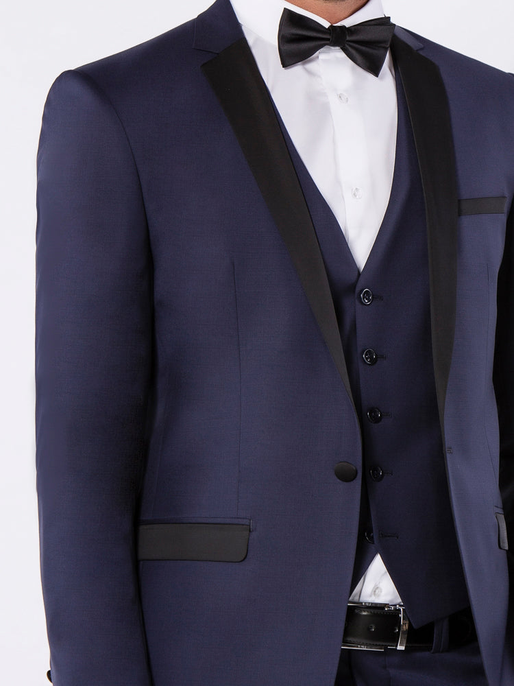 Smocking uni bleu marine / Veste 1 bouton, col tailleur satin noir, 2 poches rabats satin noir, 2 fentes dos / Pantalon poches italiennes, bas à 18 cm, 60% laine - 38% polyamide - 2%élasthanne.