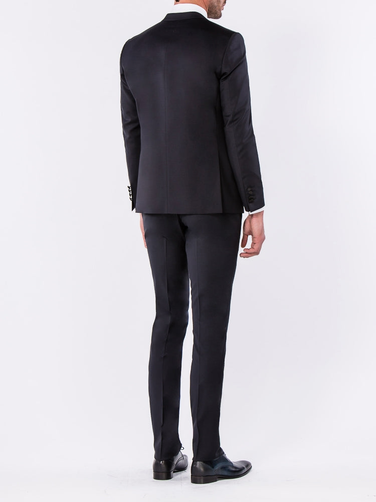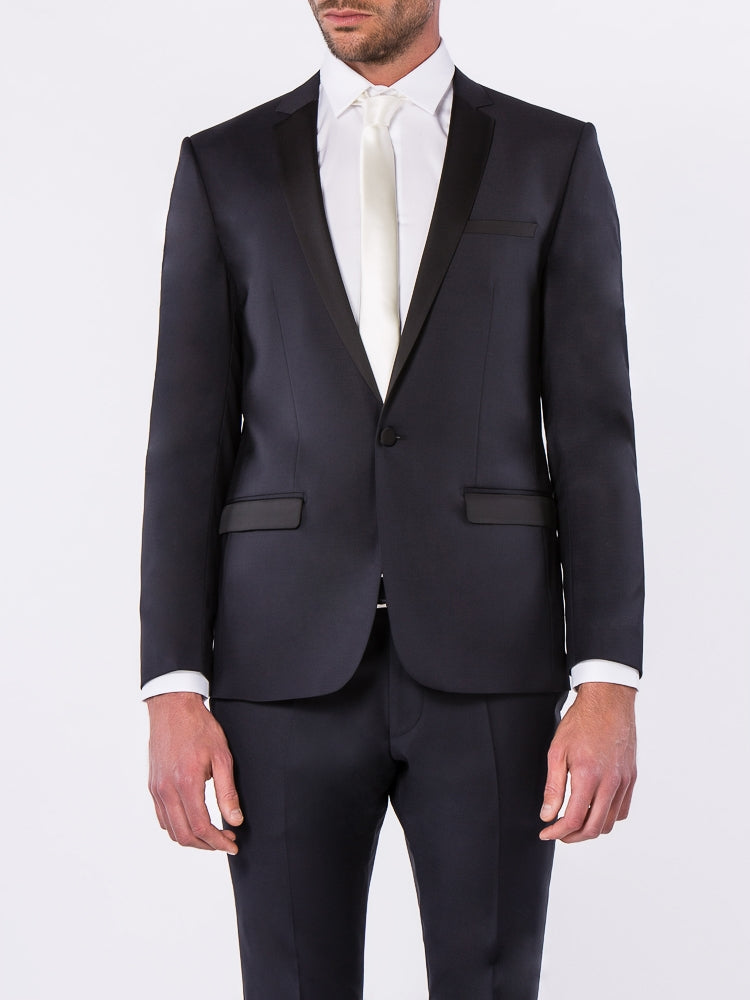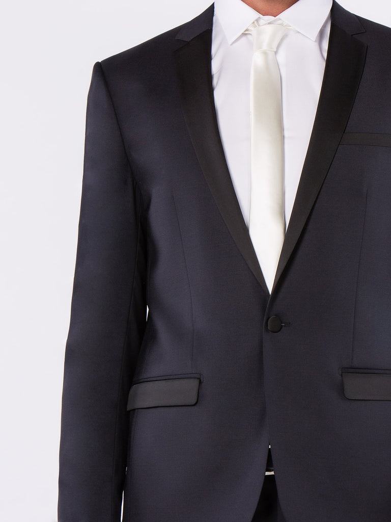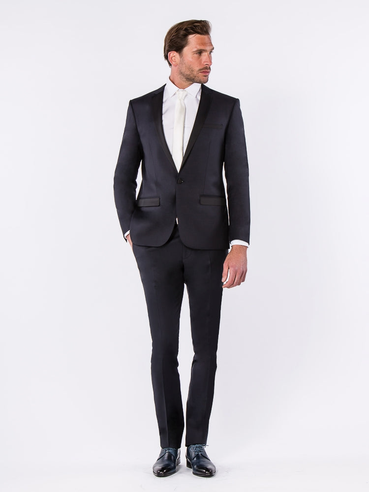 Smocking uni bleu nuit / Veste 1 bouton, col tailleur satin noir, 2 poches rabats satin noir, 2 fentes dos / Pantalon poches italiennes, bas à 18 cm, 60% laine - 38% polyamide - 2%élasthanne.
