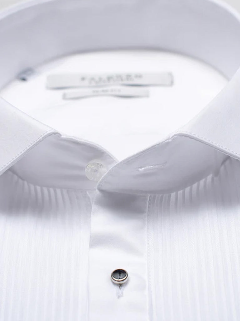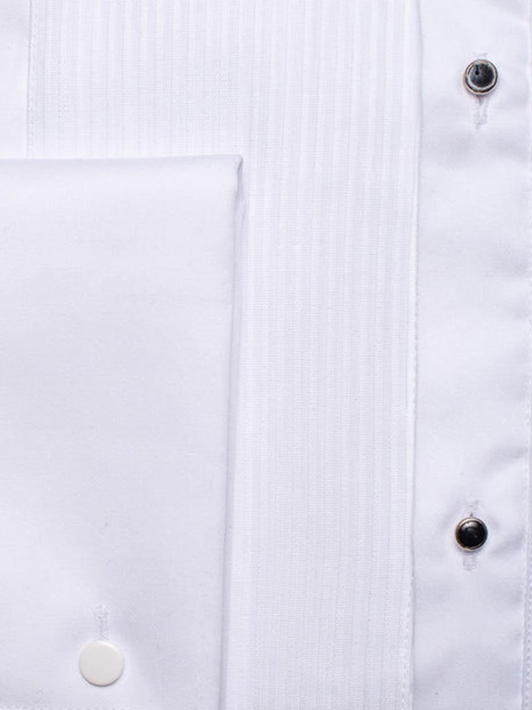 Chemise Slim Fit en popeline de coton, col cassé, plastron plissé à boutons apparents noirs et argent, poignets mousquetaires, 100% coton.