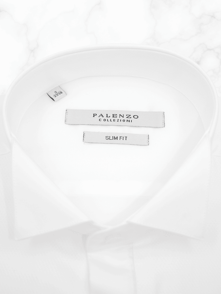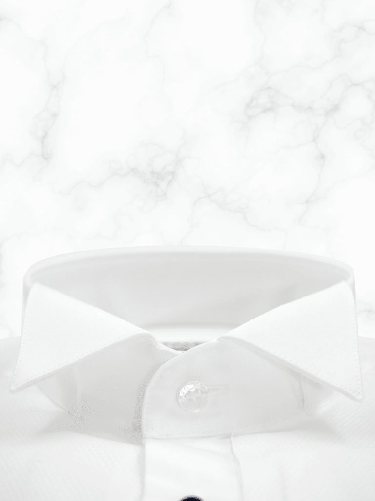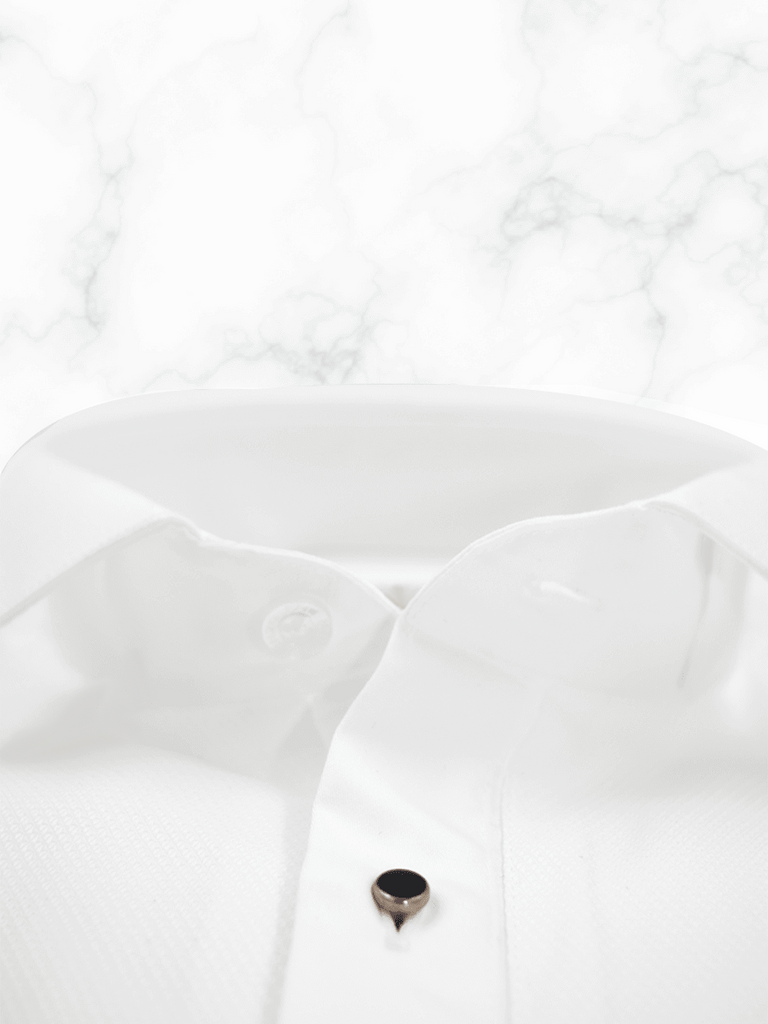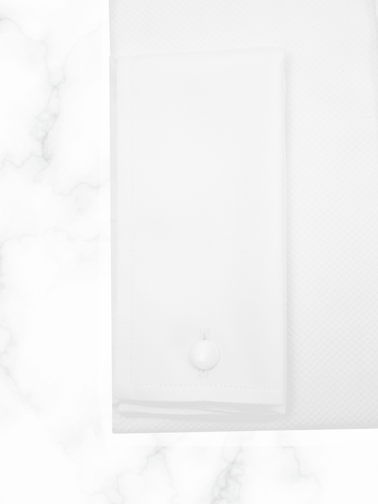 Chemise Slim Fit en popeline de coton, col cassé, plastron en piqué de coton à boutons apparents noirs et argent, poignets mousquetaires, 100% coton.