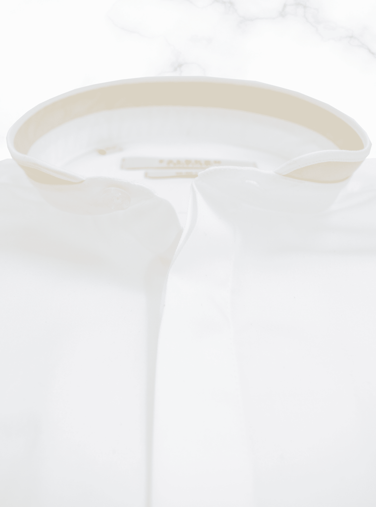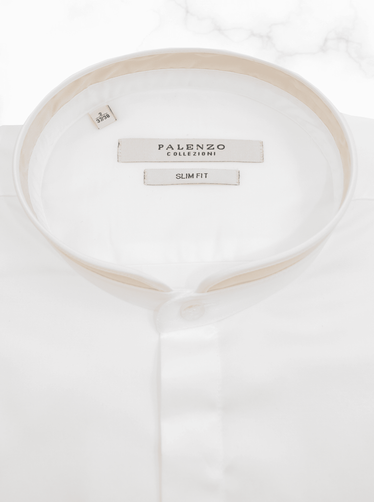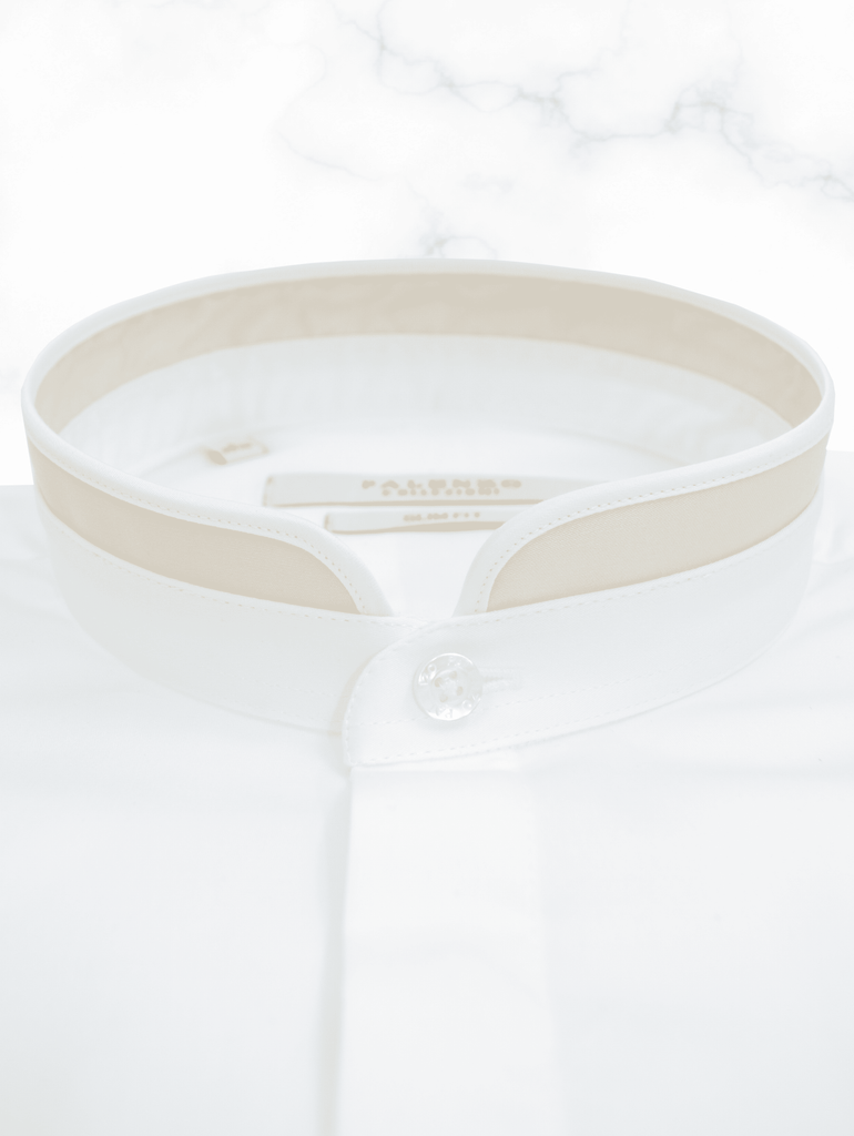 Chemise Slim Fit en popeline de coton, col officier arrondi bi couleur blanc / beige, poignets à double boutonnage, 100% coton.