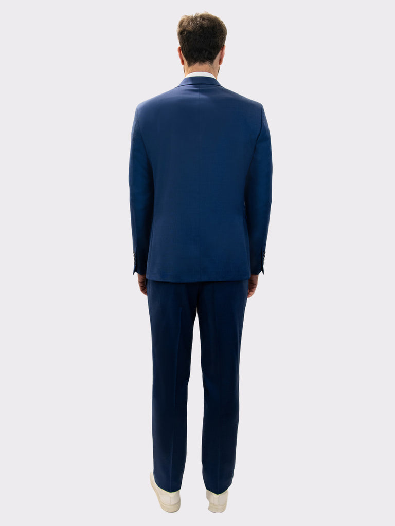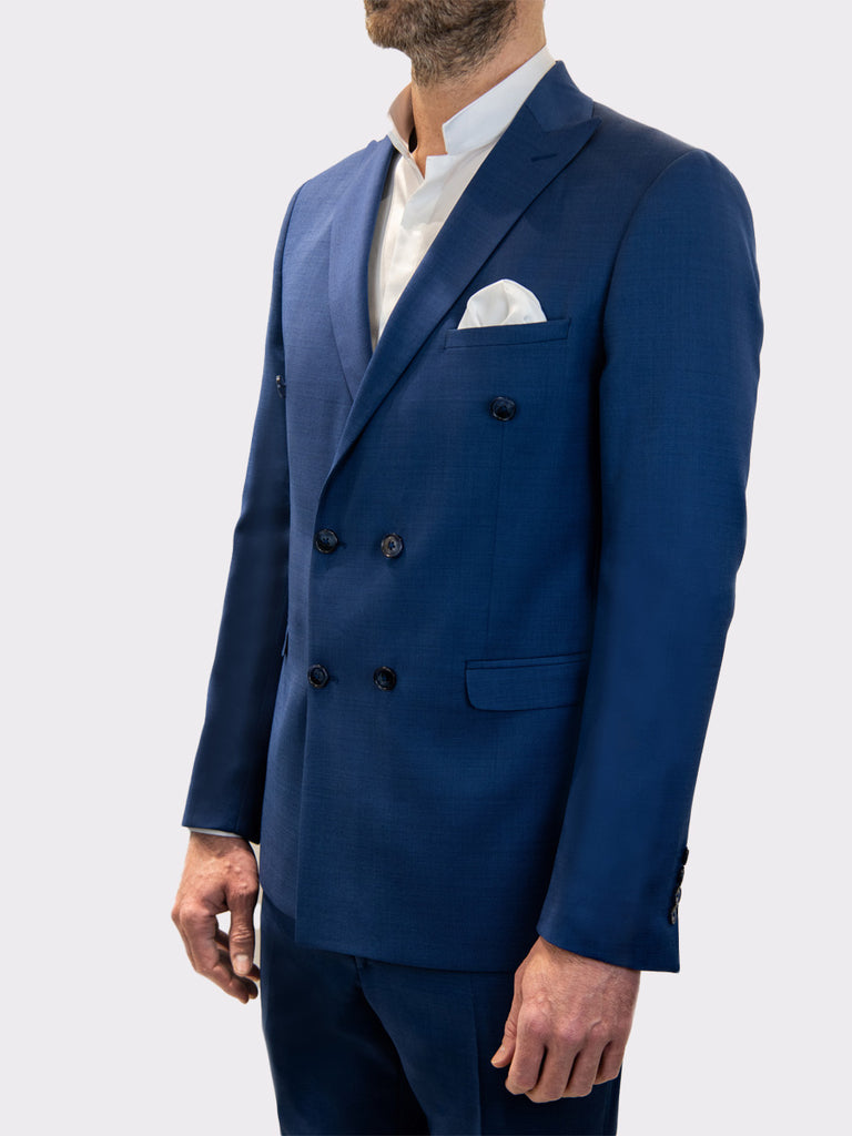 Costume croisé uni bleu / Veste 2 boutons, col tailleur, 2 poches rabats, 2 fentes dos / Pantalon poches italiennes, bas à 18 cm, 100% laine.