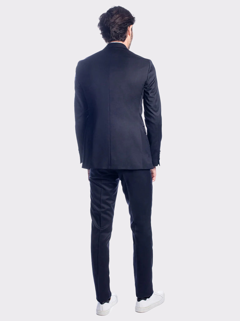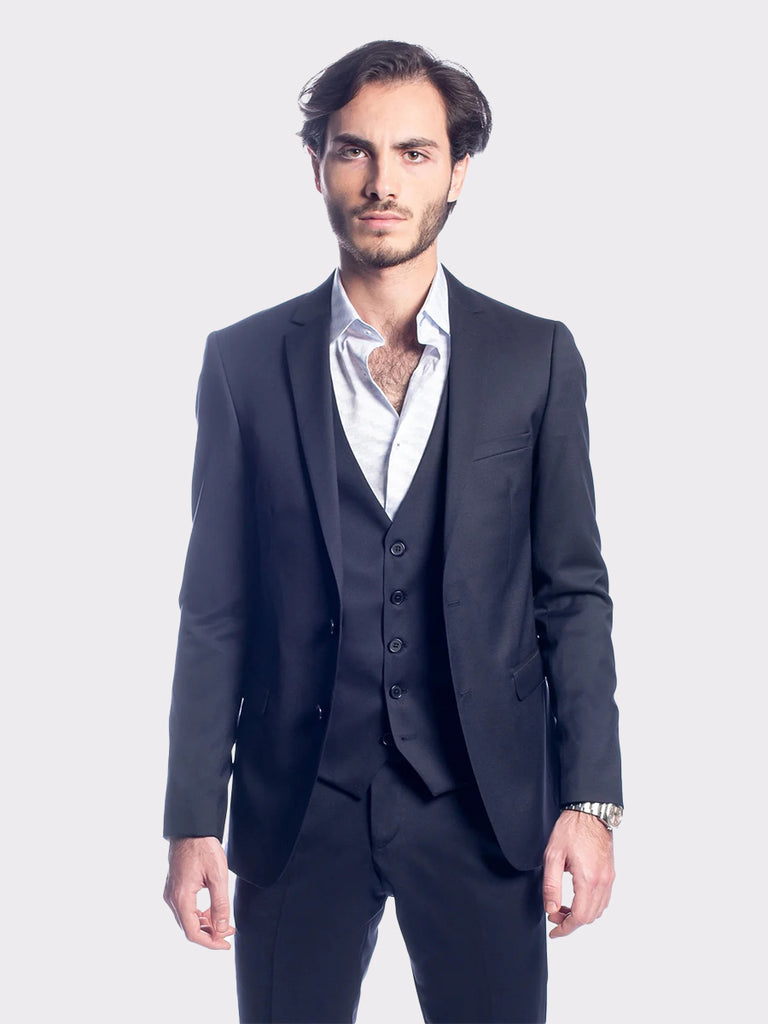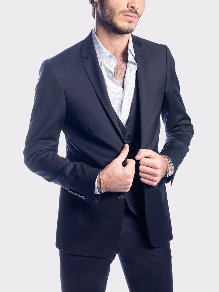 Costume 3 pièces uni bleu nuit / Veste 2 boutons, col tailleur, 2 poches rabats, 2 fentes dos /Gilet 5 boutons/ Pantalon poches italiennes, bas à 18 cm, 100% laine.