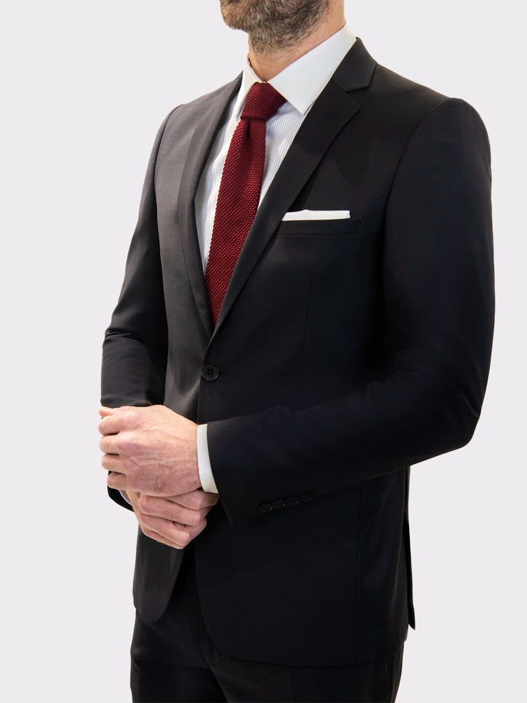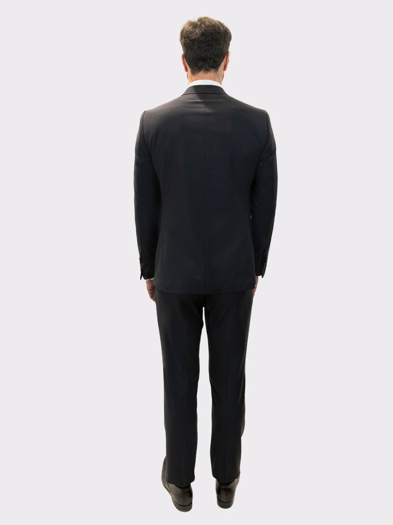 Costume uni noir / Veste 2 boutons, col tailleur, 2 poches rabats, 2 fentes dos / Pantalon poches italiennes, bas à 18 cm, 100% laine.