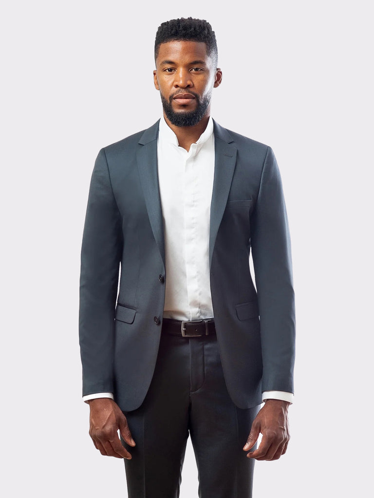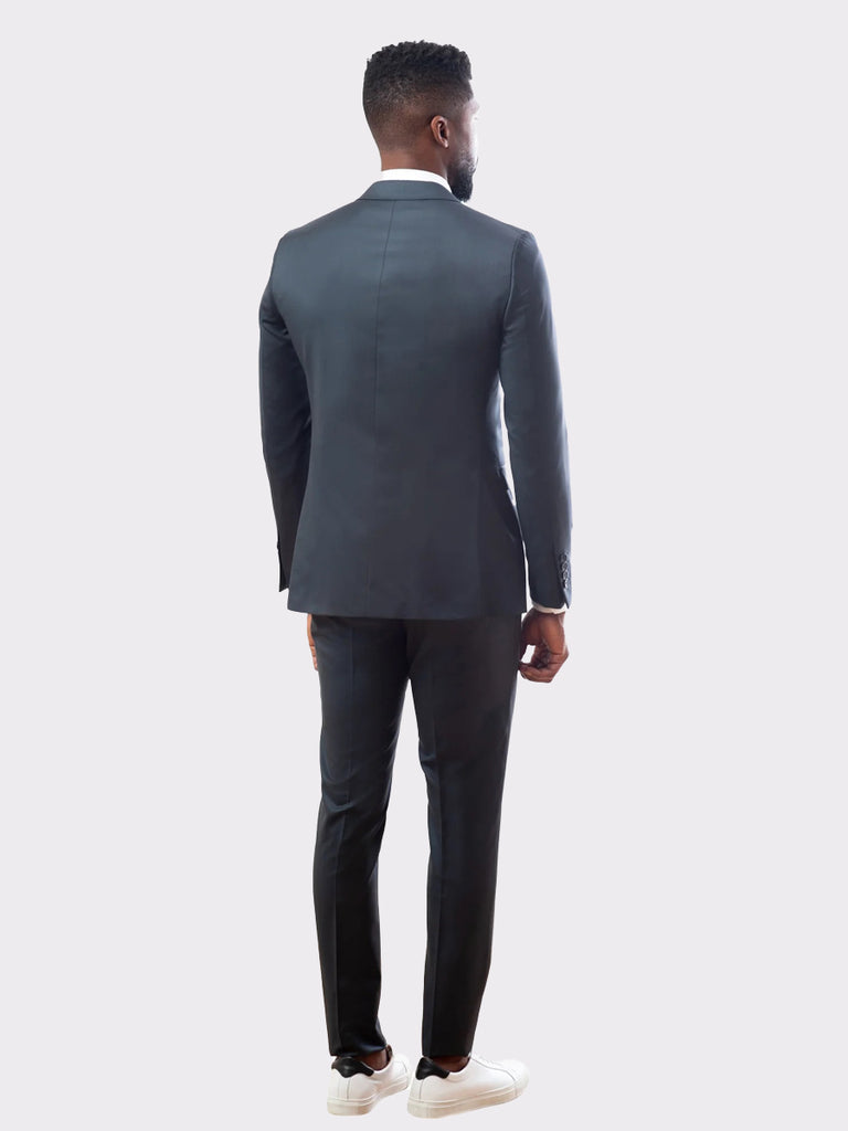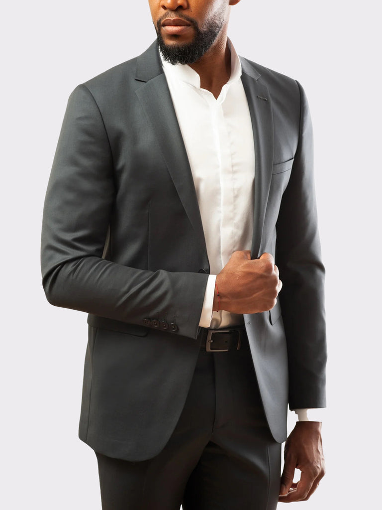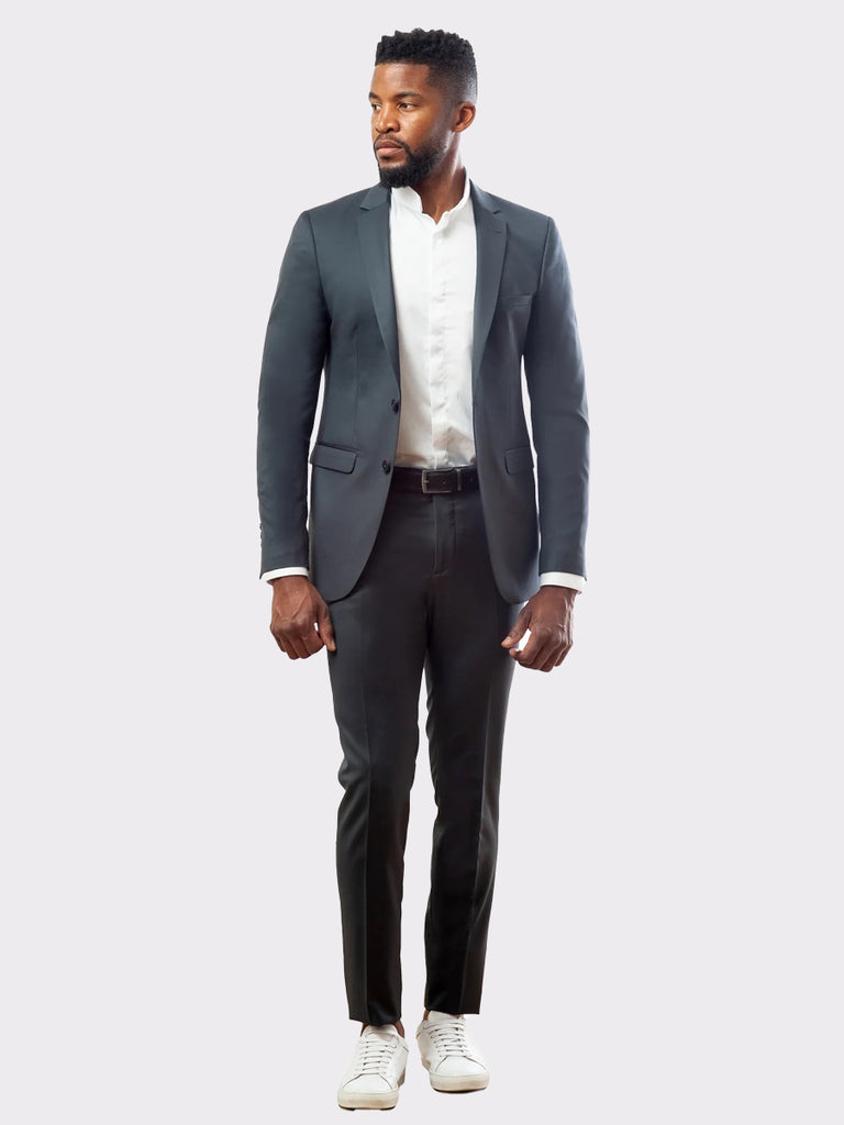 Costume uni gris anthracite Veste 2 boutons, col tailleur, 2 poches rabats, 2 fentes dos / Pantalon poches italiennes, bas à 18 cm, 100% laine.
