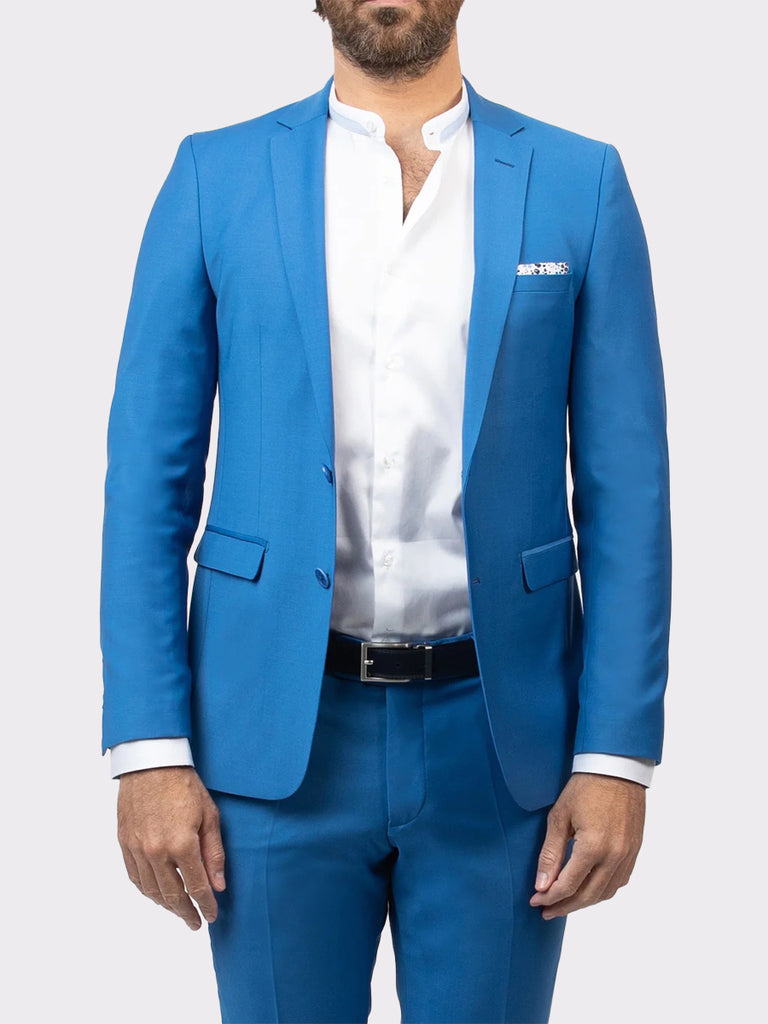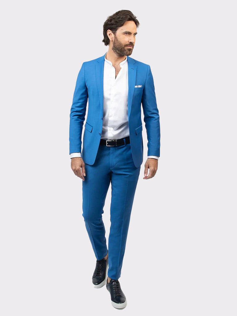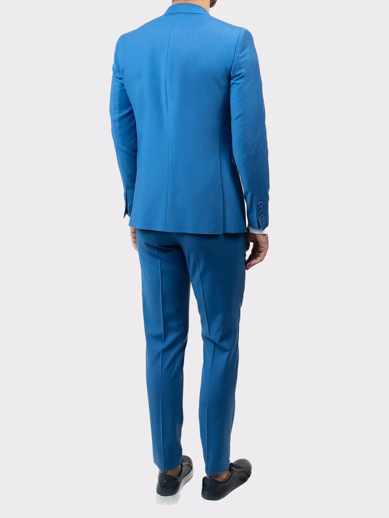 Costume uni bleu Indigo / Veste 2 boutons, col tailleur, 2 poches rabats, 2 fentes dos / Pantalon poches italiennes, bas à 18 cm, 85% laine - 11% polyamide - 4% élasthanne.