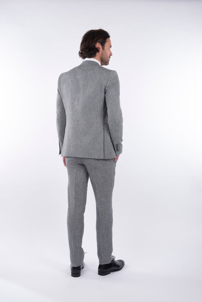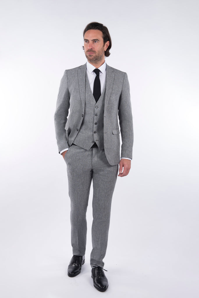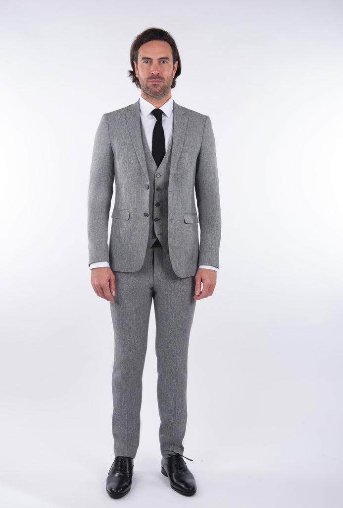Costume 3 pièces fil à fil gris / Veste 2 boutons, col tailleur, 2 poches rabats, 2 fentes dos / Gilet 5 boutons / Pantalon poches italiennes, bas à 18 cm, 65% poly, 35% viscose.