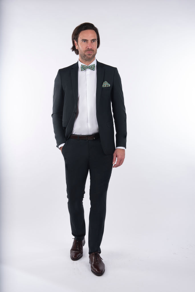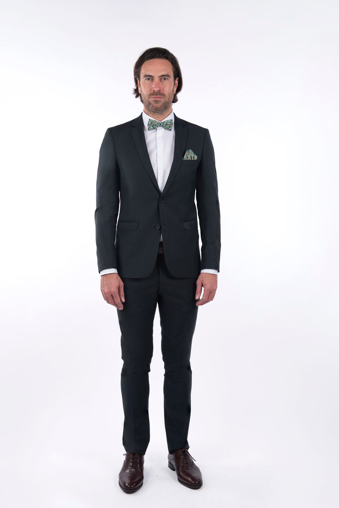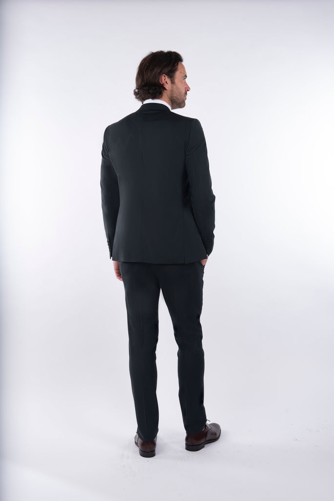 Costume uni vert bouteille / Veste 2 boutons, col tailleur, 2 poches rabats, 2 fentes dos / Pantalon poches italiennes, bas à 18 cm, 88% laine, 8% poly, 4% elasthanne.