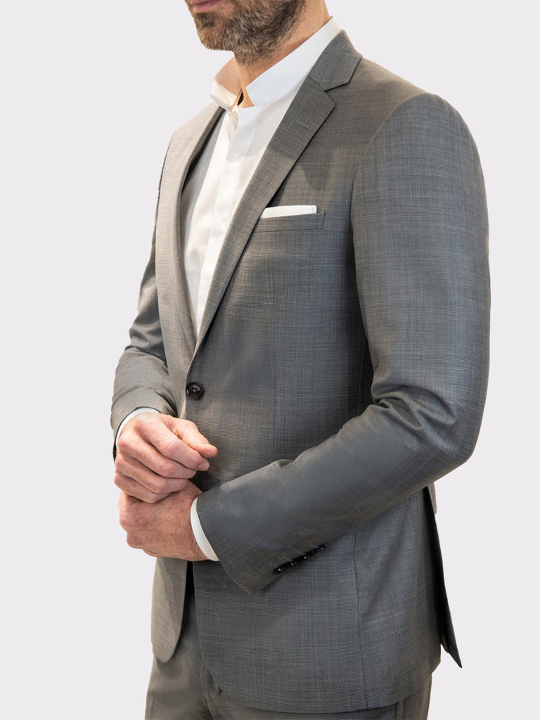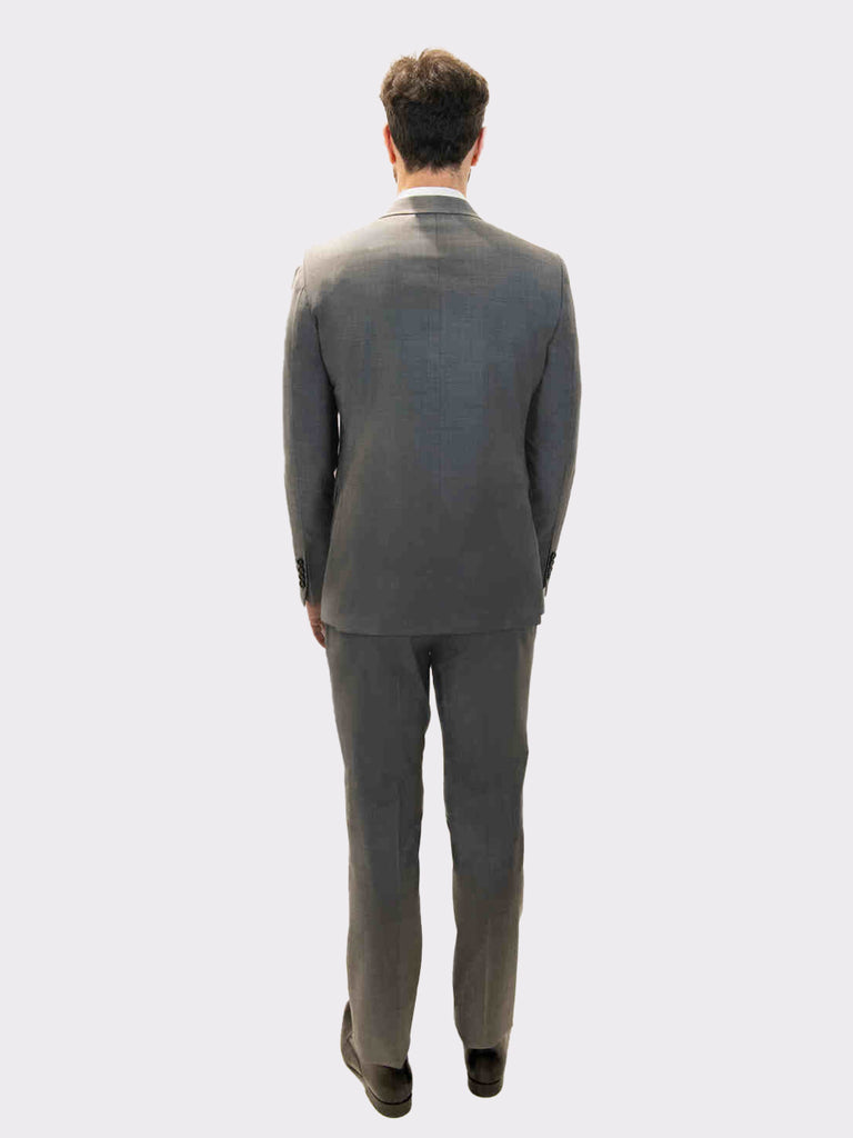 Costume carreaux gris / Veste 2 boutons, col tailleur, 2 poches rabats, 2 fentes dos / Pantalon poches italiennes, bas à 18 cm, 100% laine.