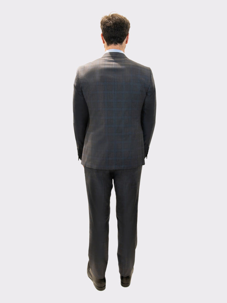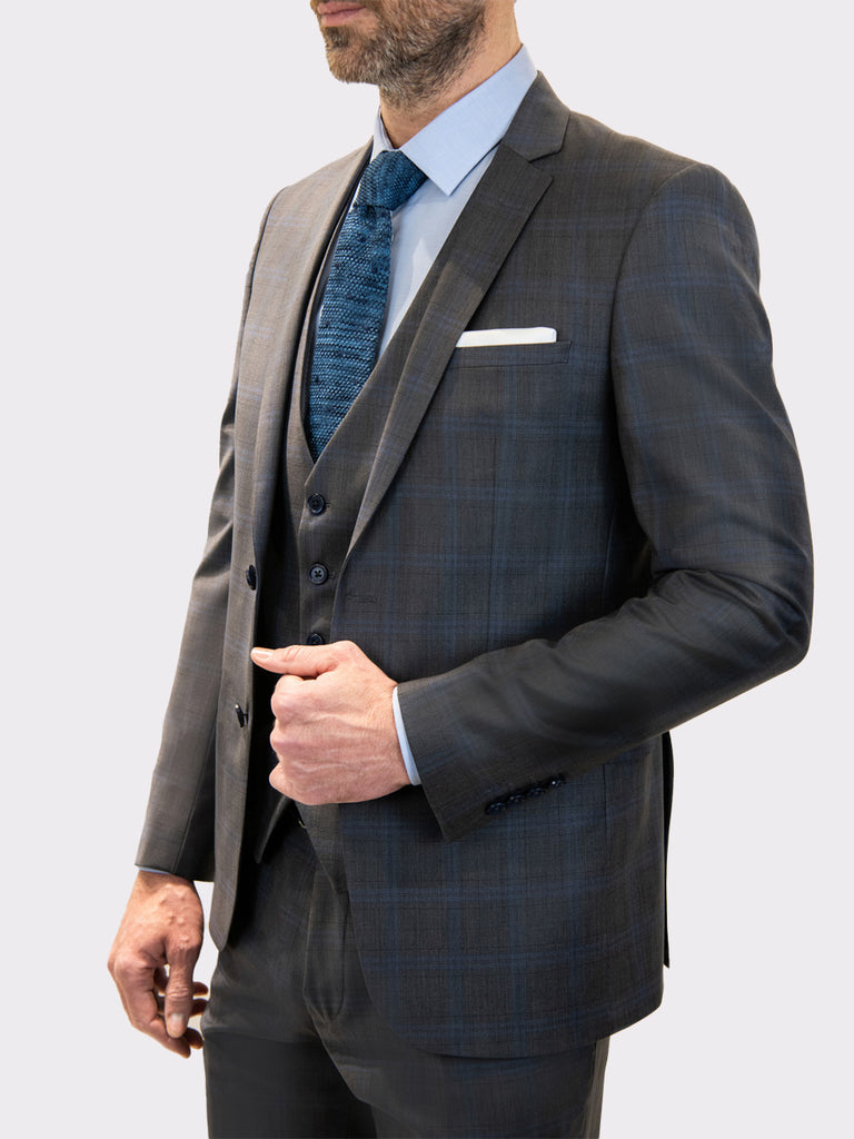 Costume 3 pièces carreaux gris et bleu / Veste 2 boutons, col tailleur, 2 poches rabats, 2 fentes dos / Gilet 5 boutons/ Pantalon poches italiennes, bas à 18 cm, 100% laine.