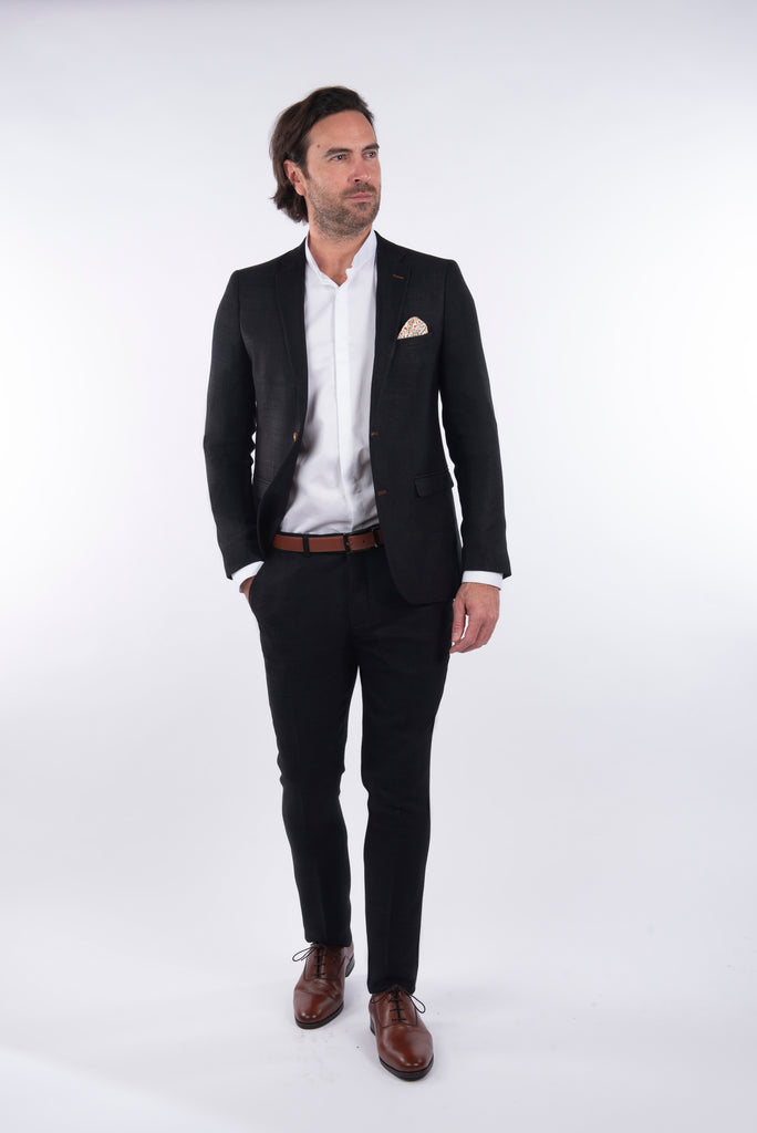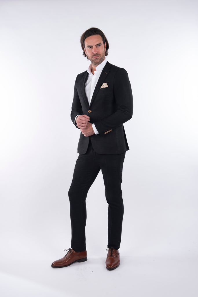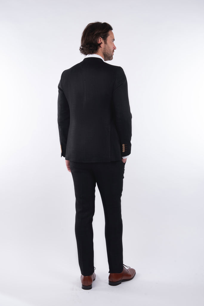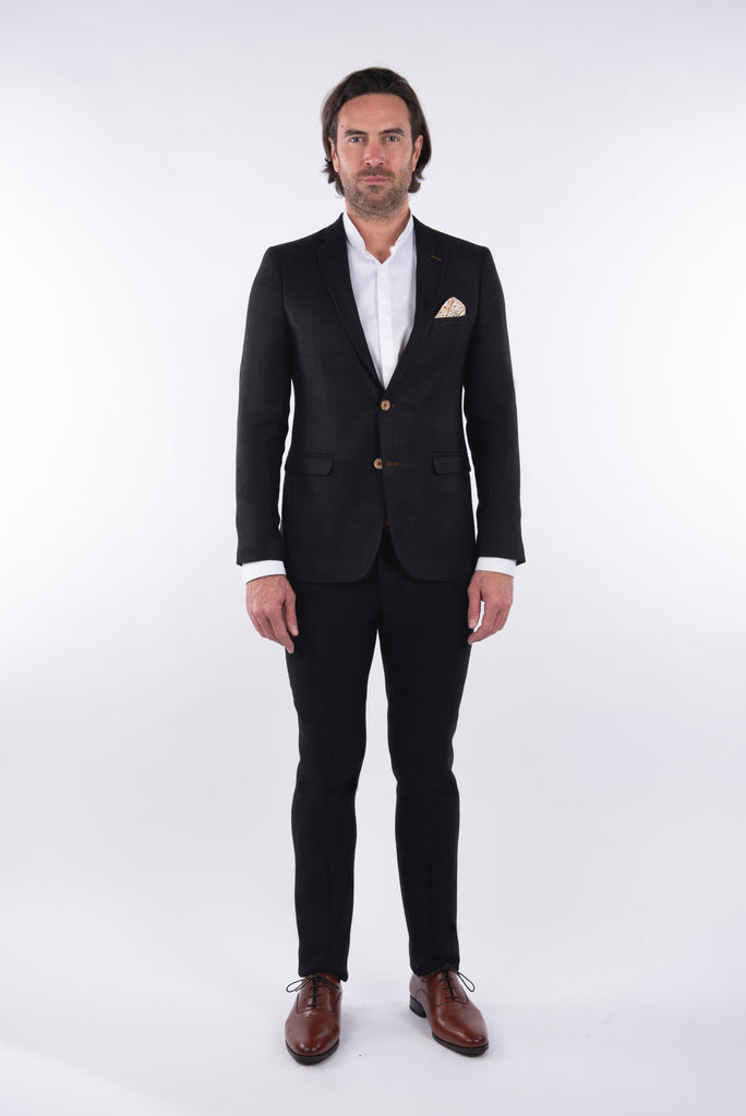 Costume texturé bleu noir / Veste 2 boutons, col tailleur, 2 poches rabats, 2 fentes dos / Pantalon poches italiennes, bas à 18 cm, 19% lin, 45% poly, 20% acrylique, 16% viscose.