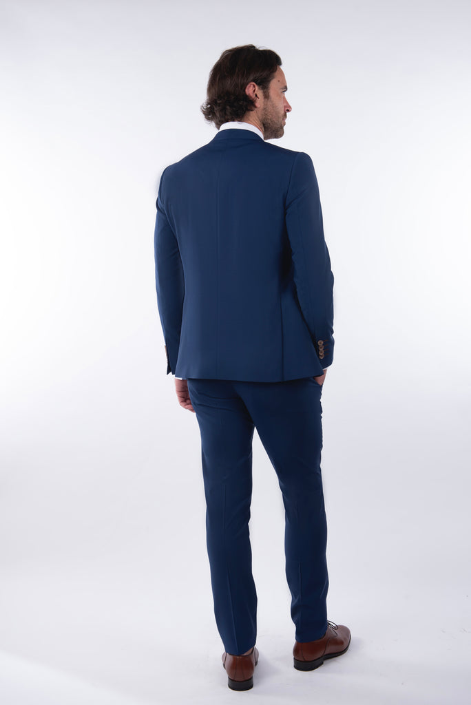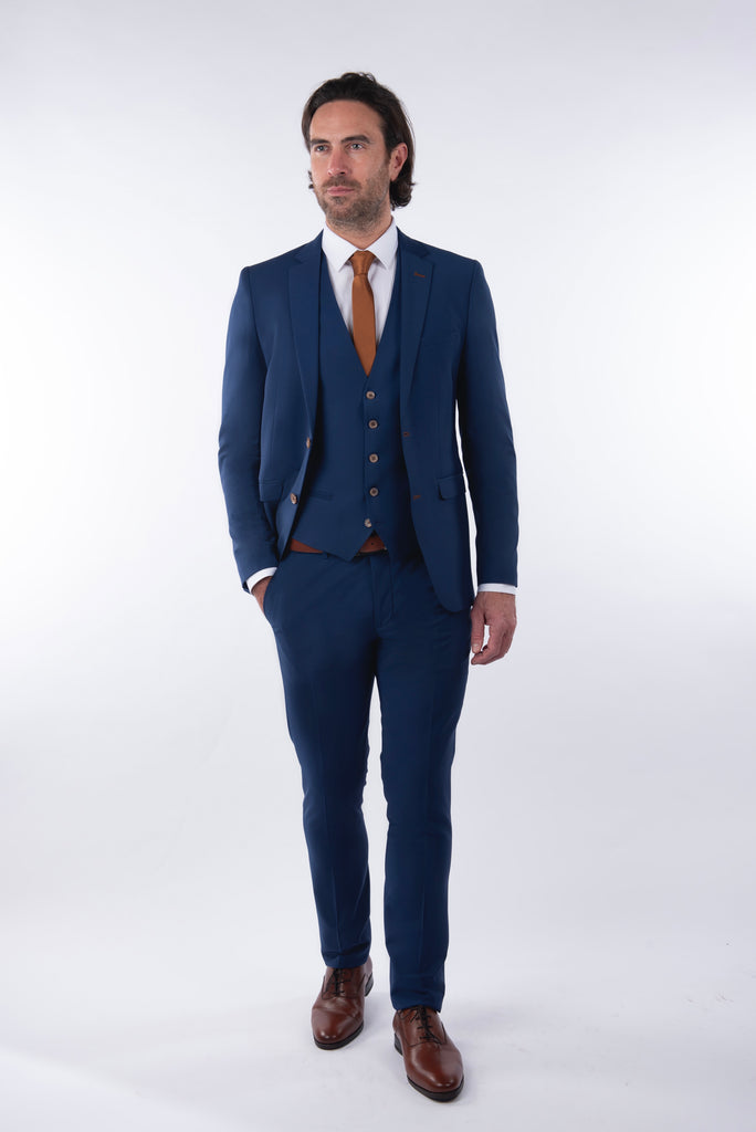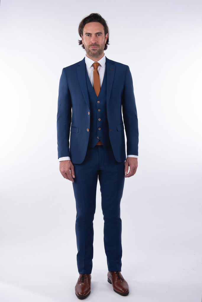 Costume 3 pièces bleu carbone / Veste 2 boutons, col tailleur, 2 poches rabats, 2 fentes dos / Gilet 5 boutons / Pantalon poches italiennes, bas à 18 cm, 44% laine, 54% poly, 2% elasthanne.