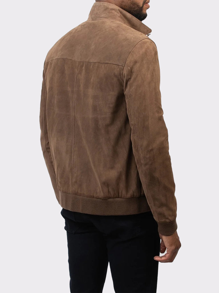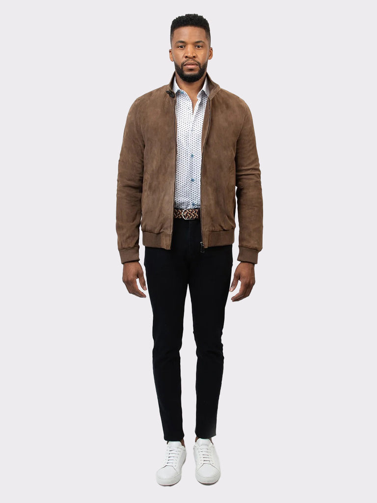 Bouson en daim camel, fermeture par zip Finition devant bord-côtes élastiqués au col, aux poignets et à l'ourlet, 100% cuir.