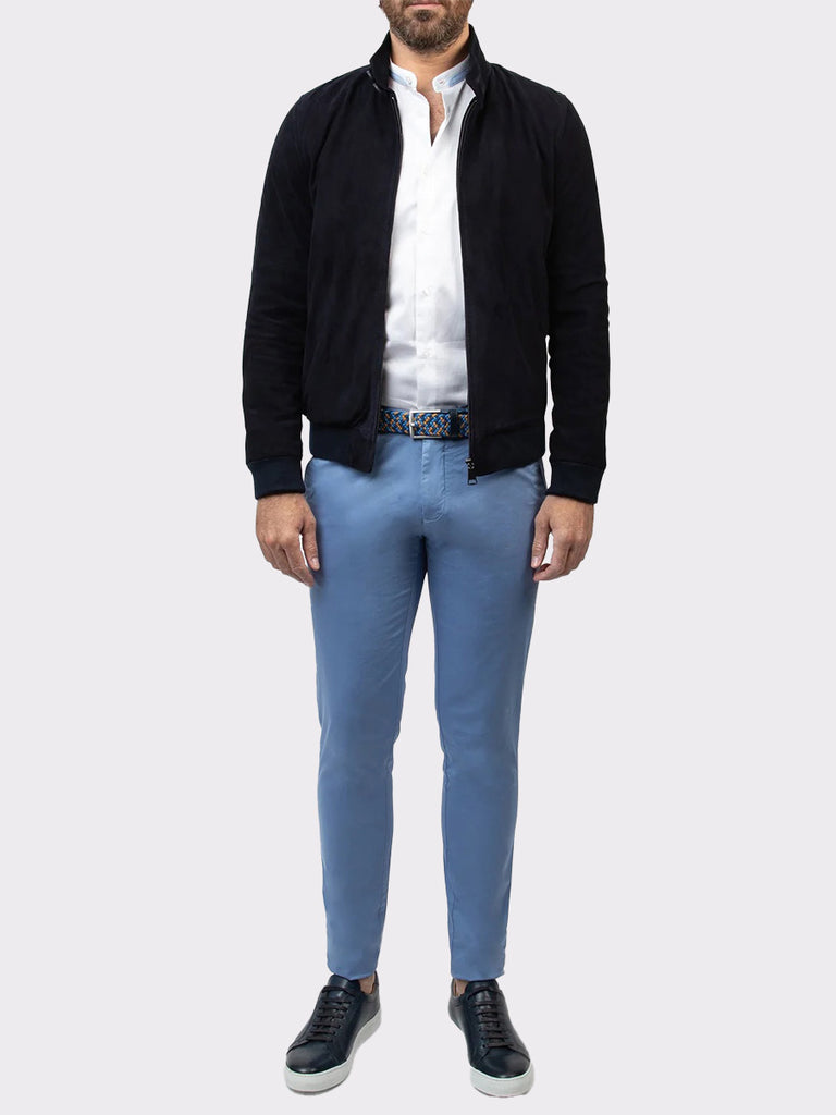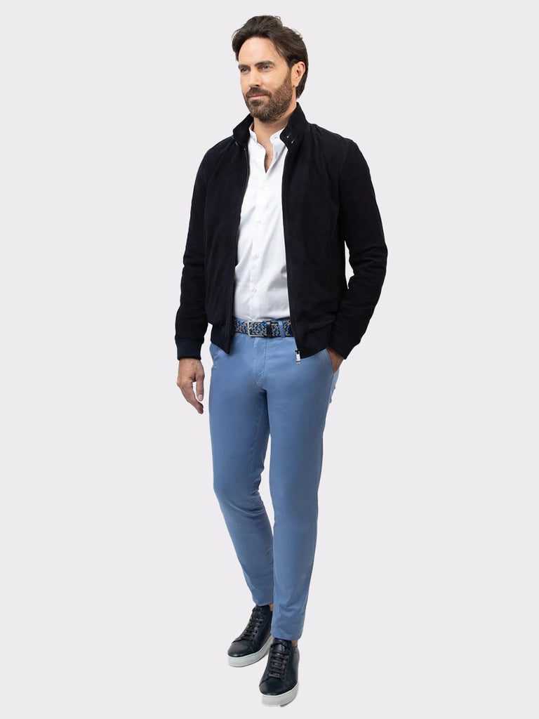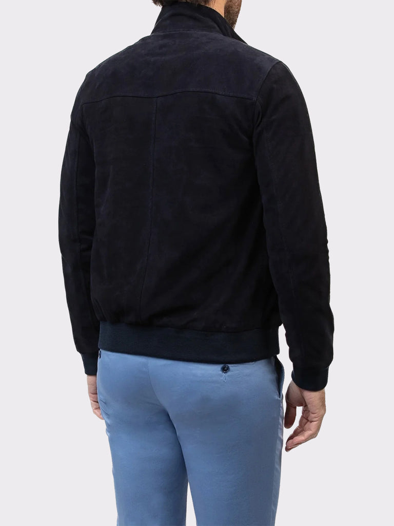 Bouson en daim marine, fermeture par zip devant Finition bord-côtes élastiqués au col, aux poignets et à l'ourlet, 100% cuir.