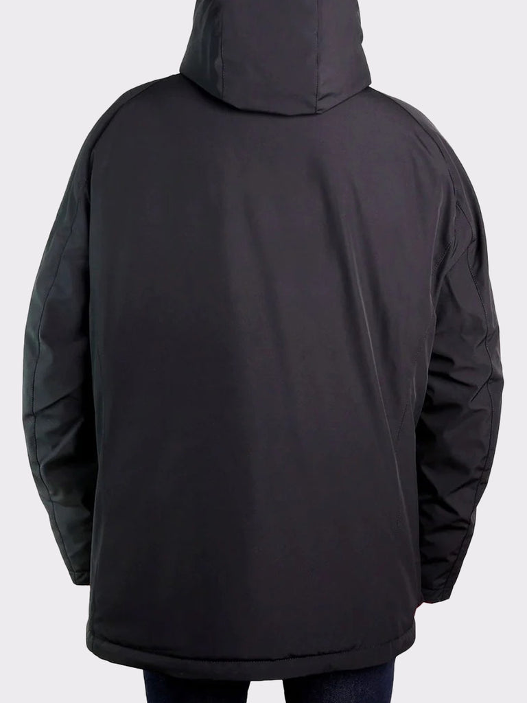 Parka noir, coupe slim, 2 poches passepoilées, fermeture avant à zip et boutons, parementure amovible, 100% polyamide.