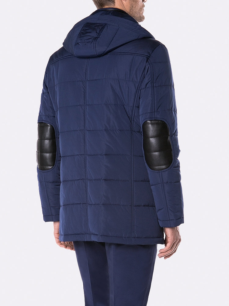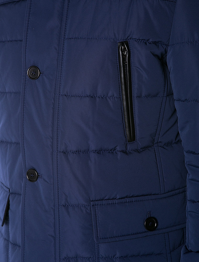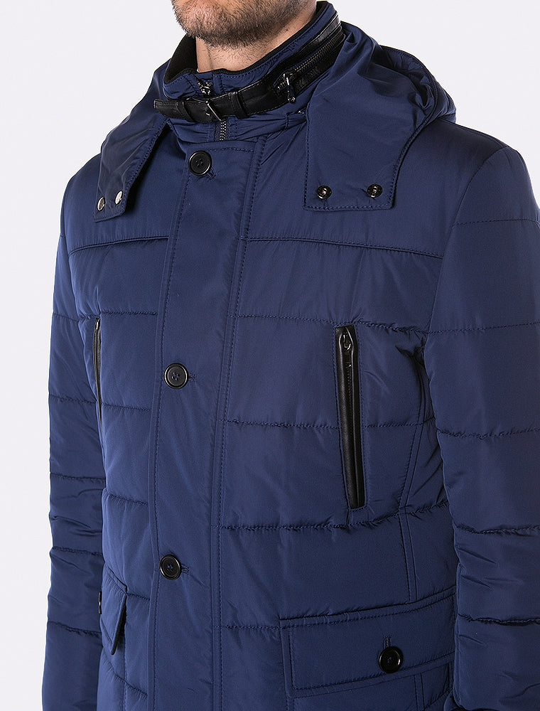 Parka bleu , coupe slim, capuche amovible, poches droites, fermeture boutonnée / Poches pectorales, fermeture zip, empiècement coudière type cuir, 100% polyamide.