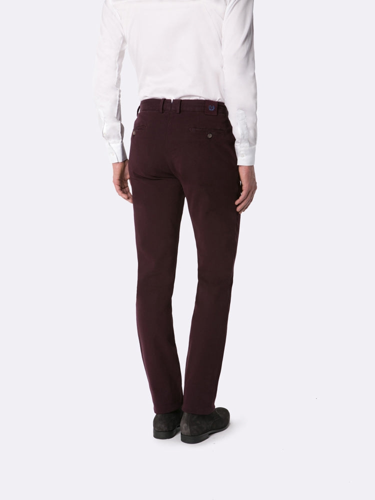 Pantalon chino bordeaux, mille raies en biais avec ceinture à bouton apparent, 2 poches italiennes, bas à 18 cm, 98% coton - 2% élasthanne.