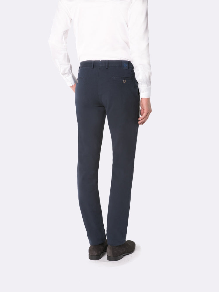 Pantalon chino bleu marine avec ceinture mille raies en biais à bouton apparent, 2 poches italiennes, bas à 18 cm, 98% coton - 2% élasthanne.