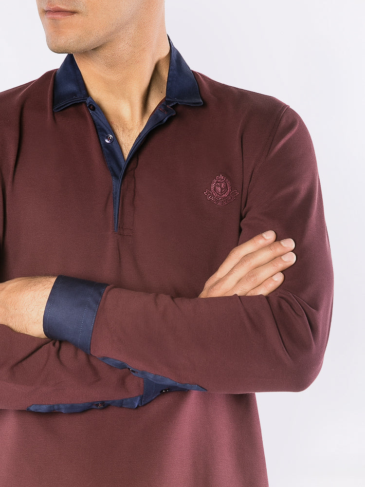 Polo bi-couleur bordeaux et bleu, manches longues, col inversé, 100% coton.