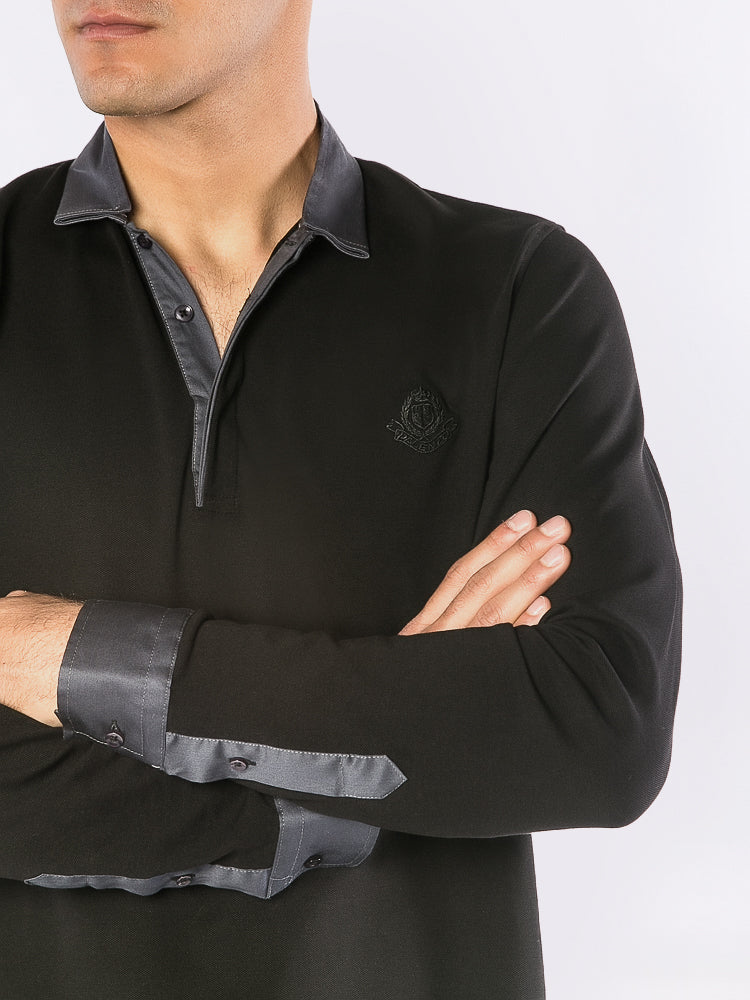 Polo bi-couleur noir et anthracite, manches longues, col inversé, 100% coton.