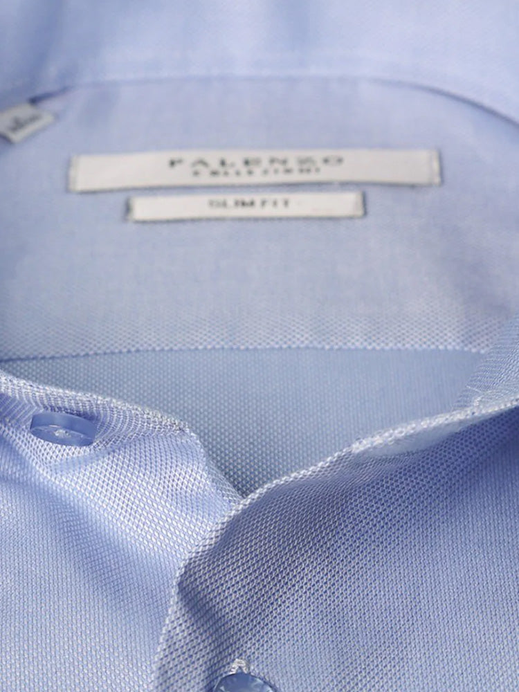 Chemise Slim Fit en popeline de coton, effet fil à fil, petit col français, poignets à double boutonnage, 100% coton.