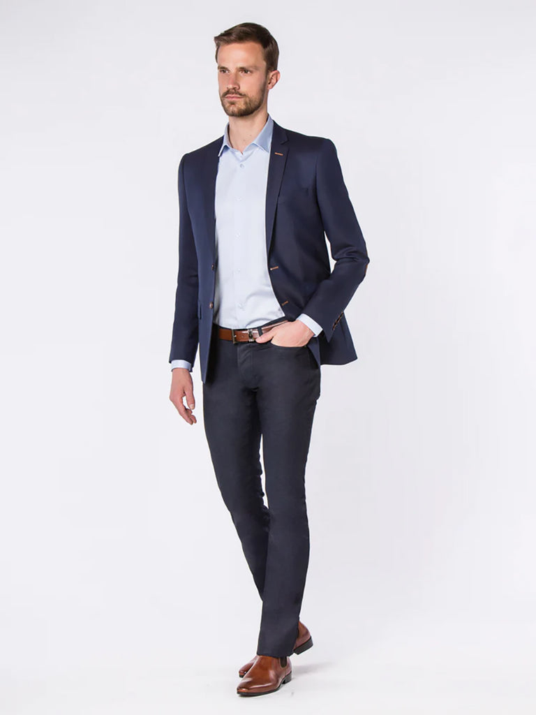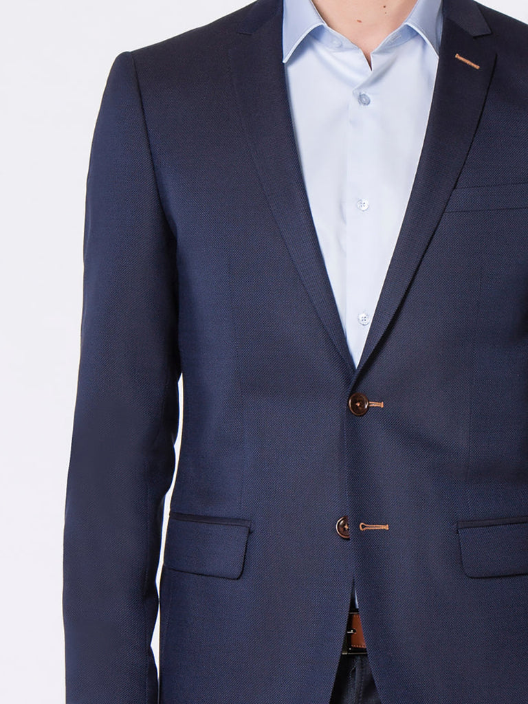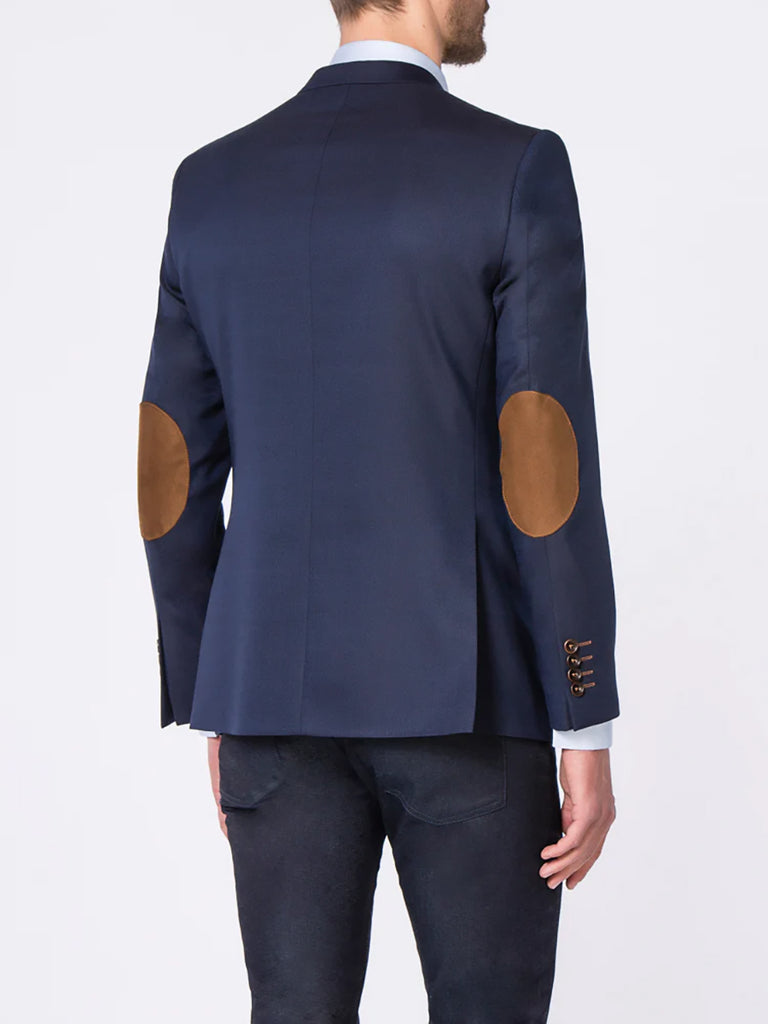 Veste micro armuré bleu marine avec 2 boutons, col tailleur, coudières et boutonnières cognac, 2 fentes dos, 74% laine - 9% polyamide - 17% polyester.