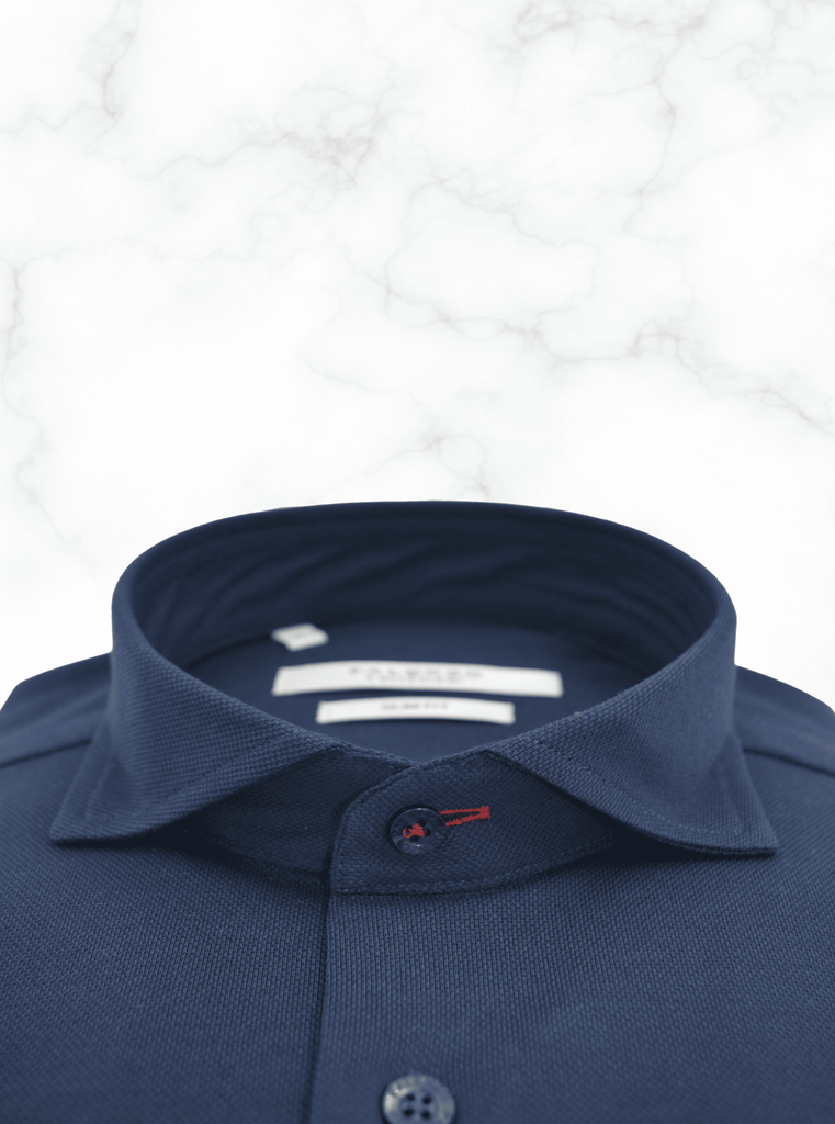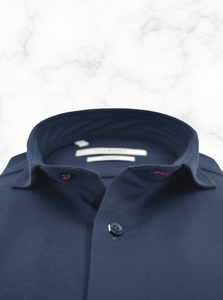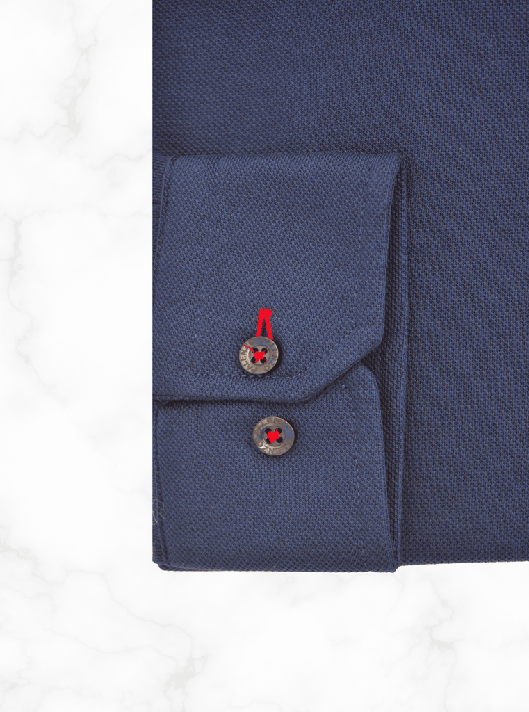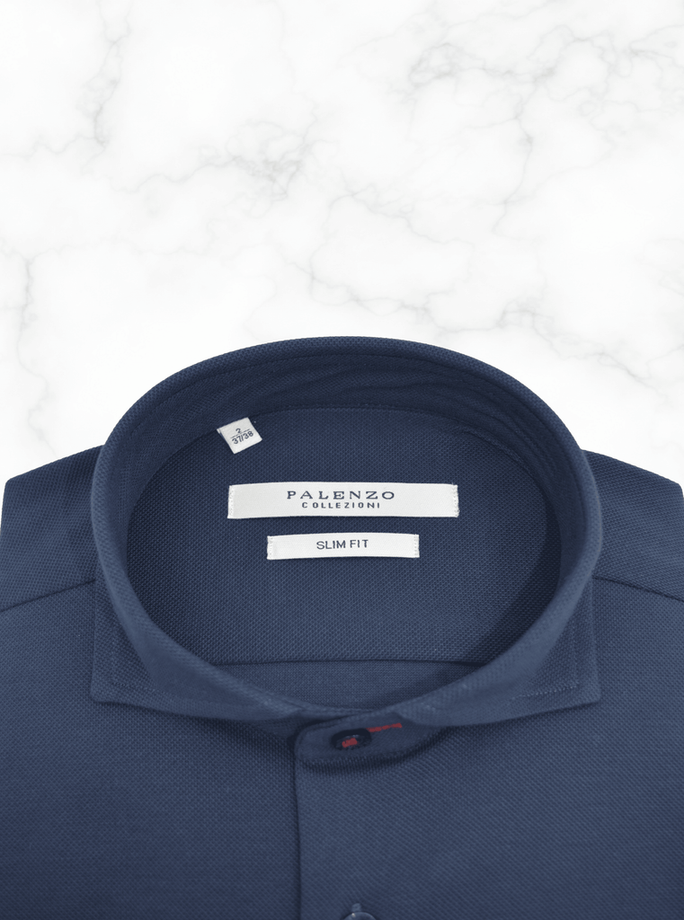 Chemise Slim Fit en piqué de coton souple, col italien, poignets à double boutonnage, 100% coton.