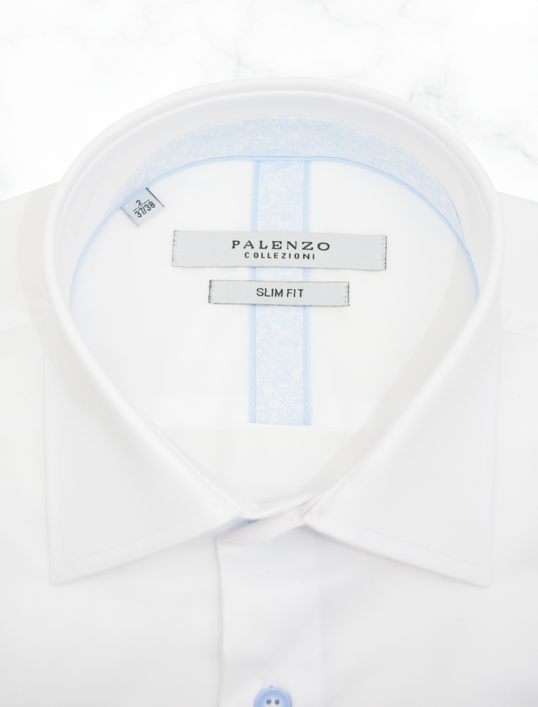Chemise Slim Fit en popeline de coton, petit col français avec ganse fantaisie col intérieur et gorge, poignets à double boutonnage, boutons fantaisie, 100% coton.