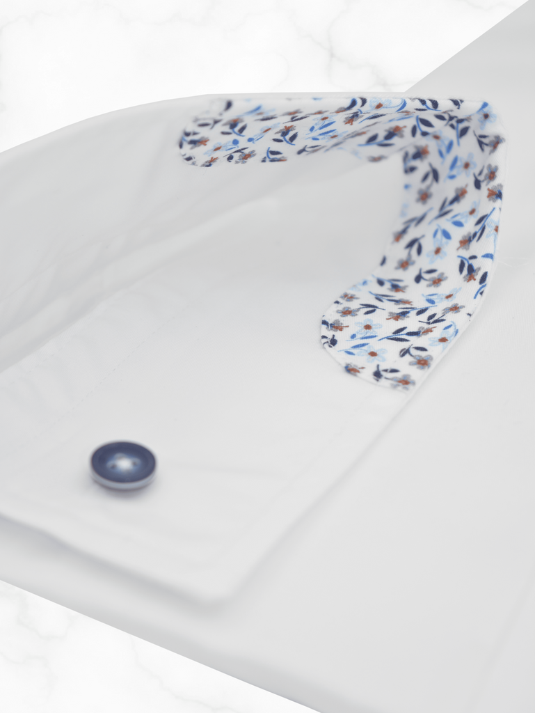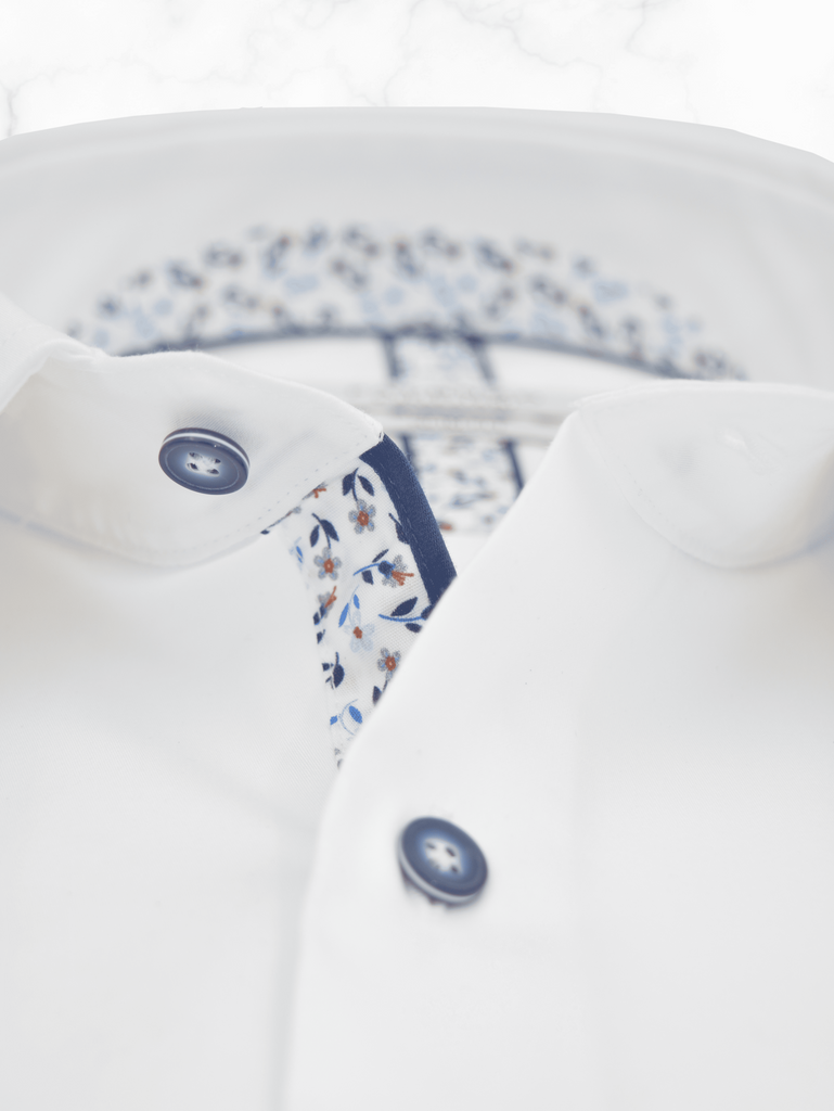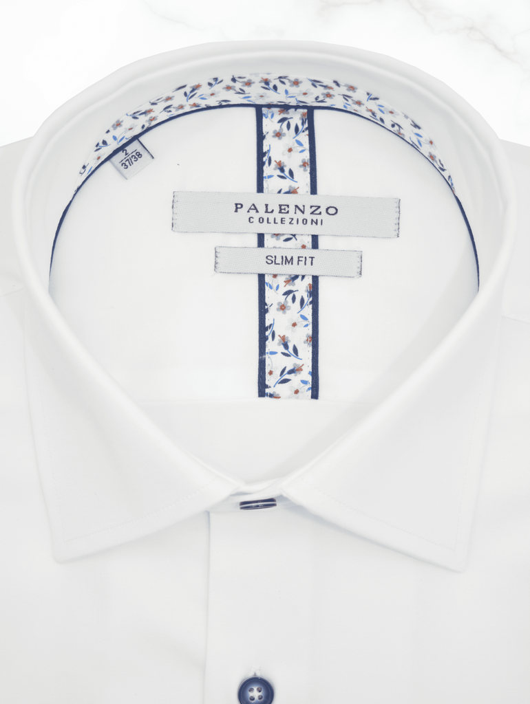 Chemise Slim Fit en popeline de coton, petit col français avec ganse fantaisie col intérieur et gorge, poignets à double boutonnage, boutons fantaisie, 100% coton.
