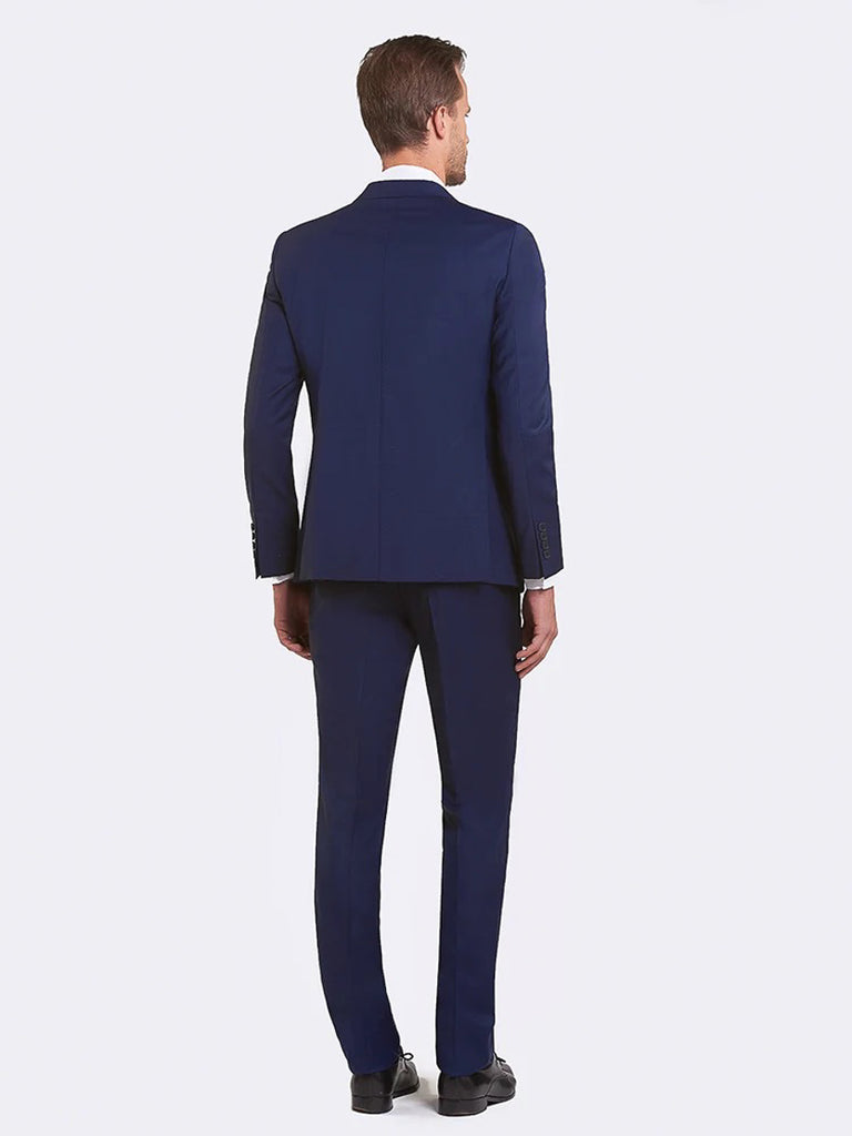 Costume uni bleu carbone / Veste 2 boutons, col tailleur, 2 poches rabats, 2 fentes dos / Pantalon poches italiennes, bas à 18 cm, 60% laine - 38% polyamide - 2% élasthanne.