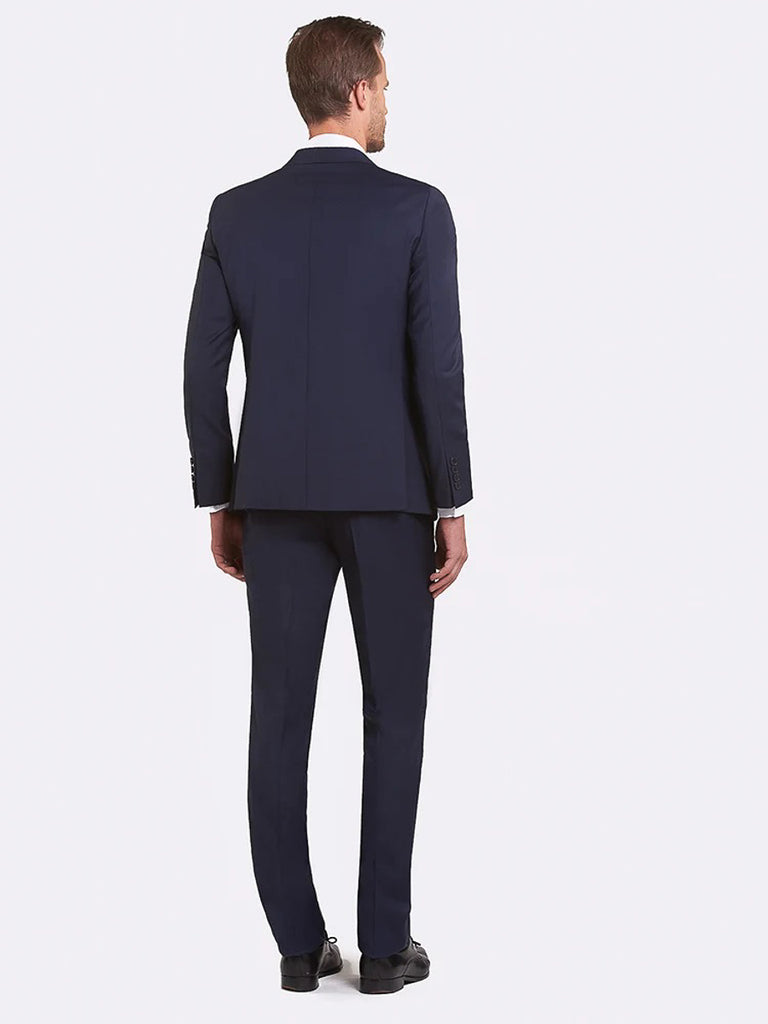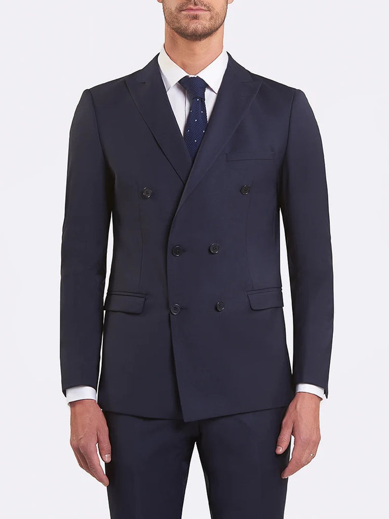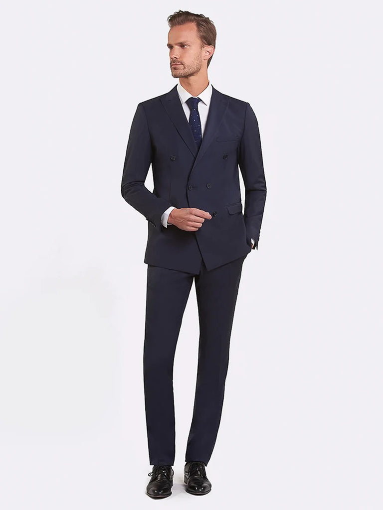 Costume croisé uni bleu marine / Veste 6 boutons, col cran aigu, 2 poches rabats, 2 fentes dos / Pantalon poches italiennes, bas à 18 cm, 60% laine - 38% polyamide - 2% élasthanne.