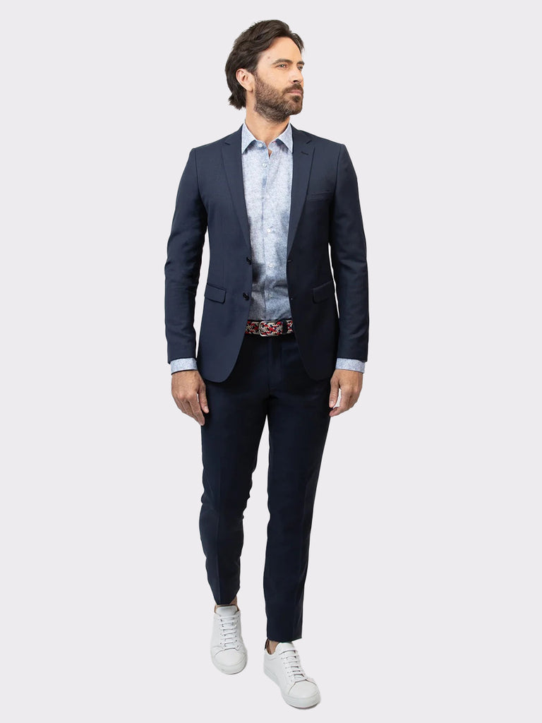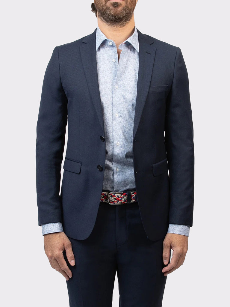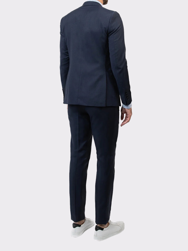 Costume micro dessin bleu Veste 2 boutons, col tailleur, 2 poches rabats, 2 fentes dos Pantalon poches italiennes, bas à 18 cm, 100% laine.