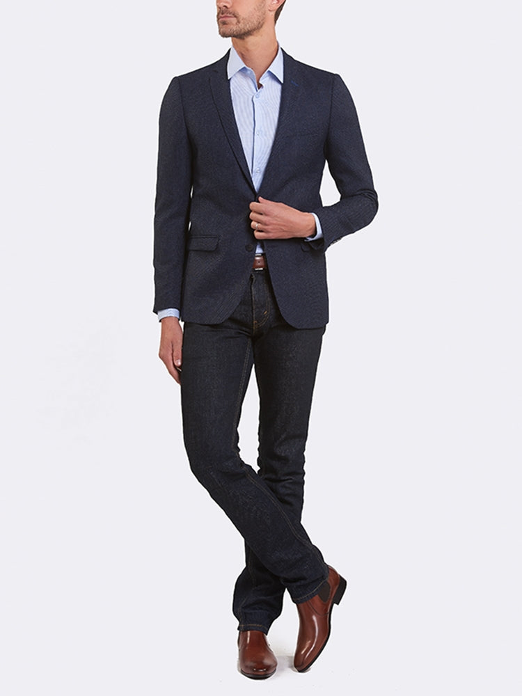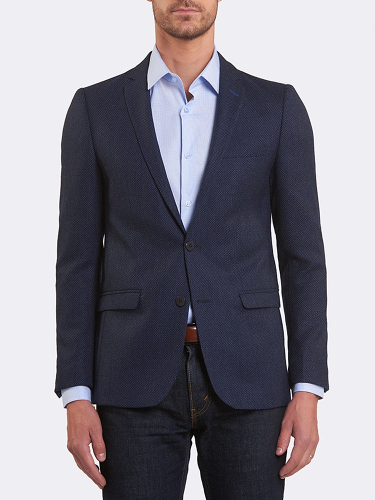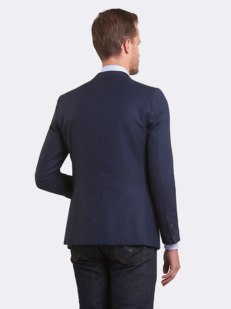 Veste micro armuré bleu avec 2 boutons, col tailleur, 2 fentes dos, 80% laine - 20% polyamide.