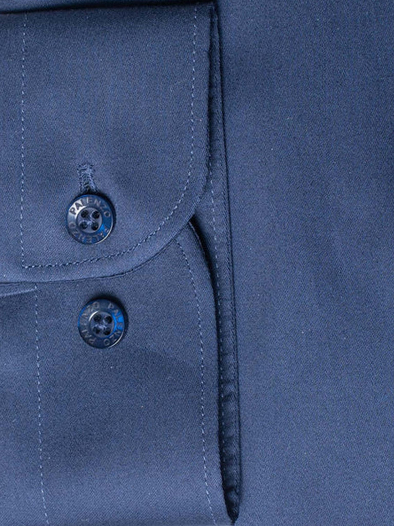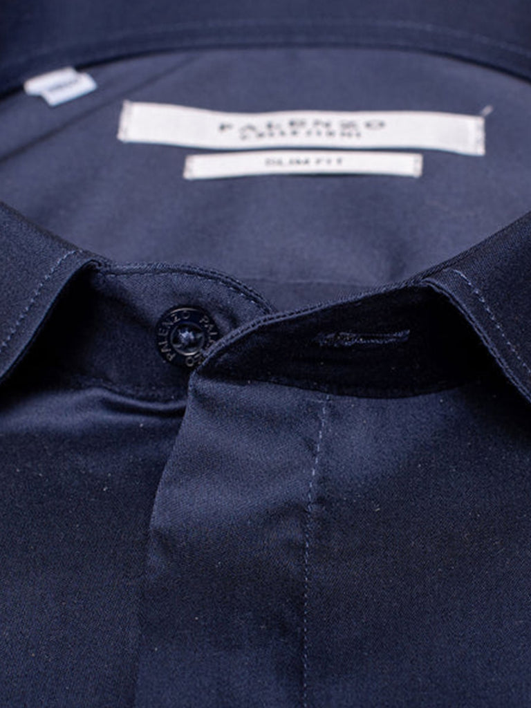 Chemise Slim Fit en popeline de coton, col club et gorge cachée, poignets à double boutonnage, 100% coton.