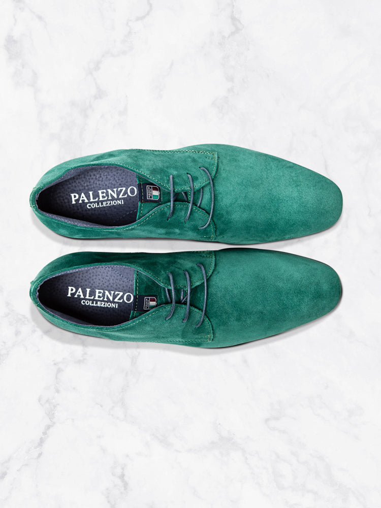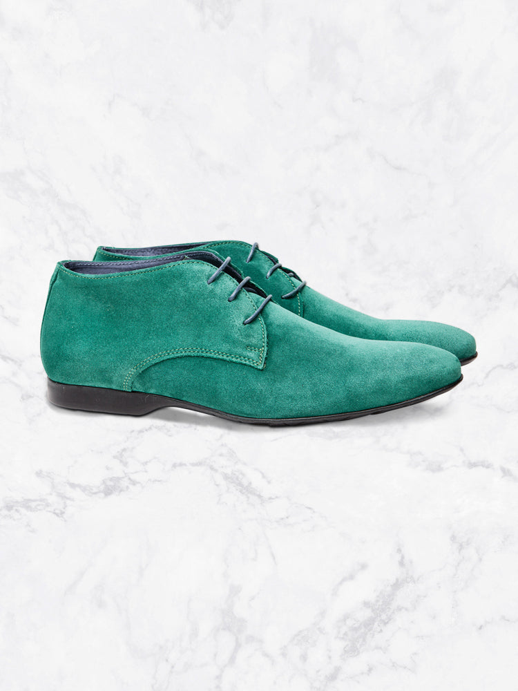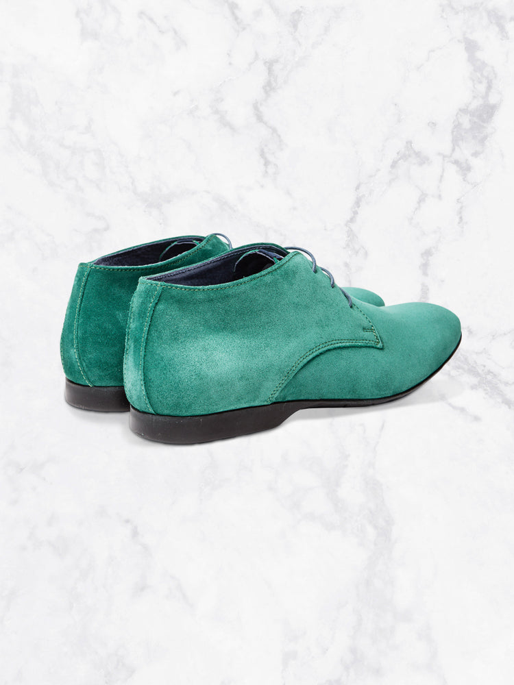 Souliers en daim vert, semelle gomme, 100% cuir.